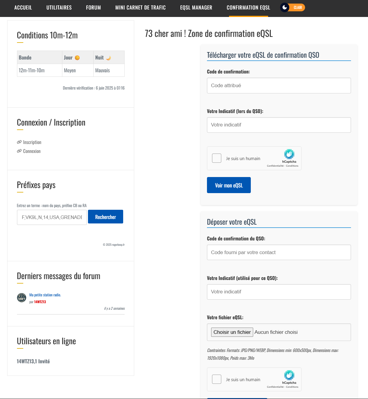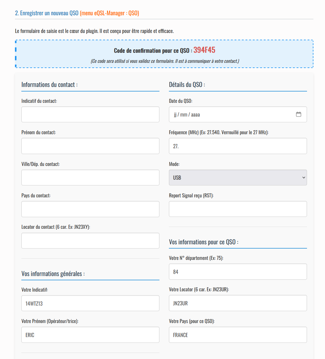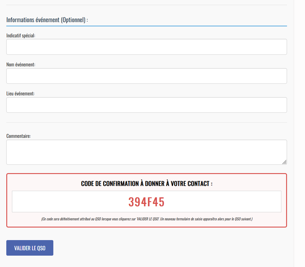 Description : Formulaire permettant la saisie dâun QSO avec gĂ©nĂ©ration automatique dâun identifiant de confirmation unique.Permet au contact de rĂ©cupĂ©rer la confirmation (eQSL) du QSO et/ou d'envoyer la sienne et qui sera automatiquement intĂ©grĂ©e au carnet de trafic privĂ©.