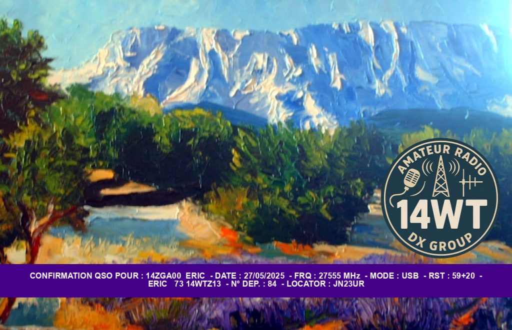 Voici un exemple d’eQSL gĂ©nĂ©rĂ©e automatiquement Ă partir des donnĂ©es du formulaire de QSO d’eQSL-Manager. Vous pouvez personnaliser divers Ă©lĂ©ments, tels que la taille, la couleur et la position verticale de la bande (ici reprĂ©sentĂ©e en violet), ainsi que la couleur et la taille du texte. De plus, il est possible de sĂ©lectionner les informations spĂ©cifiques du QSO Ă inclure dans l’eQSL. Notez que le logo et l’image de la montagne Sainte-Victoire font partie de mon image personnelle.